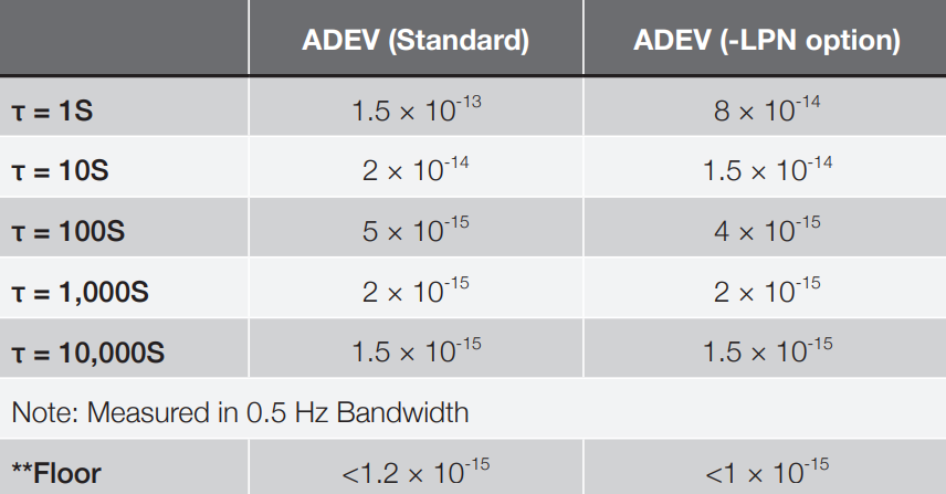 **Note: Typically achieved after extended period of unperturbed, continuous operation. Temperature variation: ±0.25°C. Relative humidity: ±10%. **Daily Aging <3 × 10-16 (typical) Note: Achievable after >3mo's operation while applying integrated drift compensation software