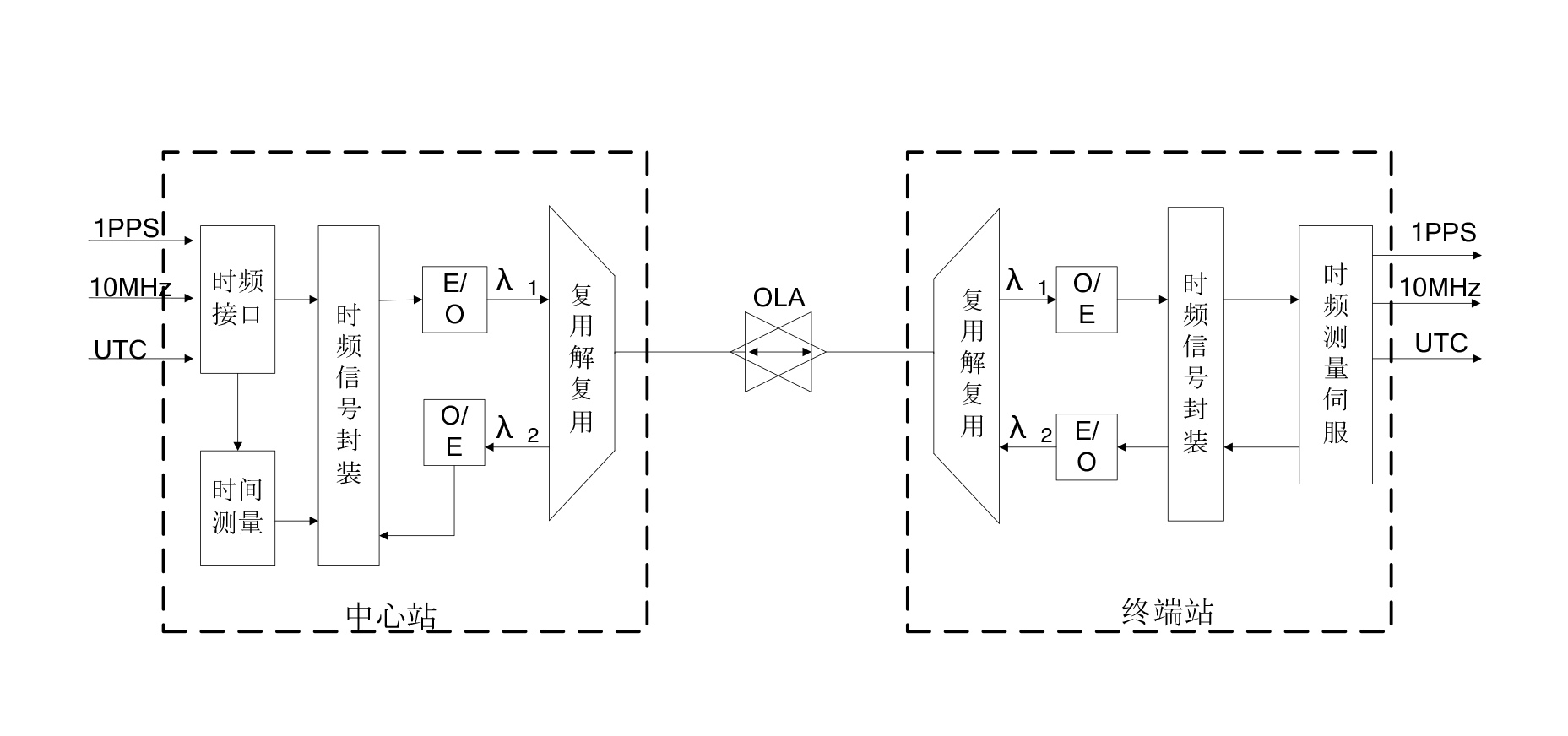 授时终端站由波长复用解复用单元、光/电和电/光转换单元和时频测量伺服单元构成。该授时系统利用经典的双向时间比对方法,依托光纤信道(DWDM波长通道)实现高精度的时频同步。设备运行稳定抗、干扰能力强,可实现100公里40ps同步精度。可应用于深空探测、国防、科研等对同步精度要求较高的领域。